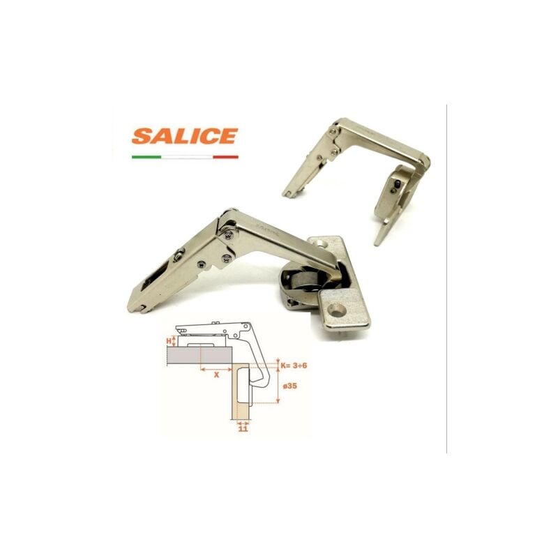 SALICE - CERNIERA C2AYA99 PER ANTE AD ANGOLO DI MOBILI E CUCINE APERTURA ANGOLO 70o - Chiusura a scatto - Fissaggio con due viti. - Foro su anta mm. 35. - Profondita' della scatolina metallica 11 mm. - Apertura 70o - Spessore massimo dell'anta a spigolo vivo mm. 23 - Possibilita' di foratura dell'anta 'K' da 3 a 9 mm. - Adattabili a tutte le basi tradizionali Serie 200, ed alle basi Domi a innesto rapido (base non inclusa nella vendita)