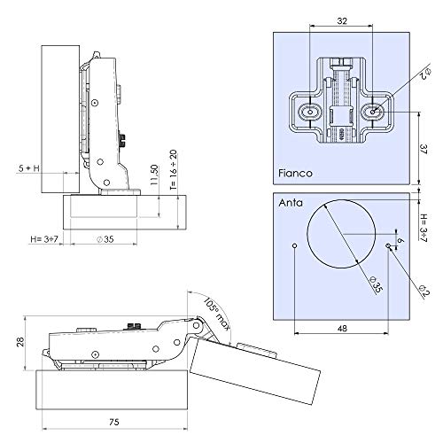 Cerniera in acciaio nichelato, apertura 105°, chiusura automatica e ammortizzata