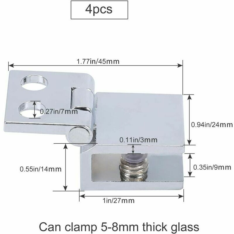 individuare il paraurti e fissare la posizione per evitare che la porta dell'armadio si apra automaticamente.,Dimensioni: cerniera in vetro a un lato 0°, lunghezza totale 45 mm, 9 mm, adatta per vetro di spessore 5-8 mm. L'uso di viti antiscivolo è più antiscivolo e più sicuro., Ampiamente usato: le cerniere per porte in vetro senza telaio sono fissate sulla parete laterale, utilizzate per il fissaggio sulla porta in vetro, come la porta del bagno, la vetrina, la vetrina, cantinetta, ecc. Facile da usare: le cerniere a morsetto per porta sono facili da installare, molto comode, basta inserire il vetro nella scanalatura e serrare le viti. Fare