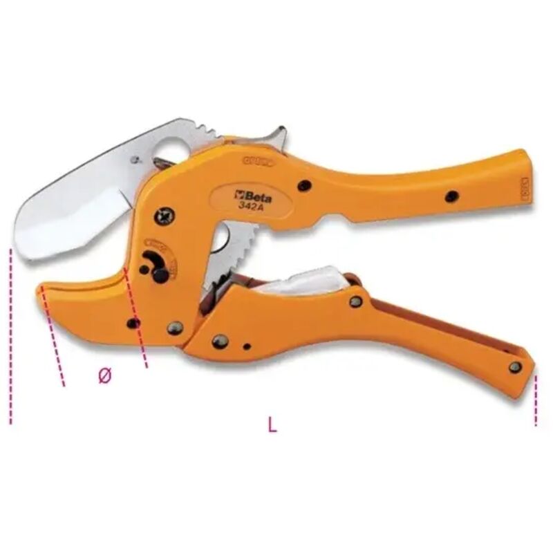 Descrizione CESOIA A CRICCHETTO PER TUBI IN PVC DA 2-50MM - BETA 342A Cesoia a cricchetto per tubi in materiale plastico Diametro Taglio: da 2 a 50 mm L mm: 270