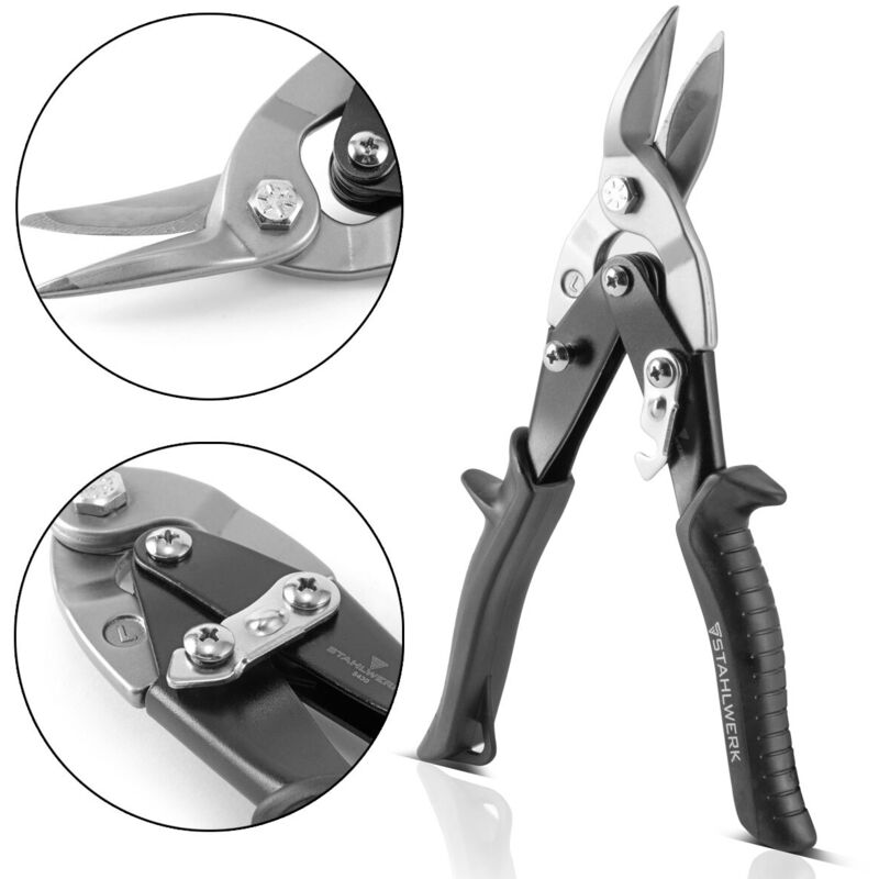 Cesoie per lamiere professionali STAHLWERK taglio a sinistra Acciaio al cromo-vanadio per lamiere fino a 1,25 mm di spessore. Le robuste cesoie per lamiera STAHLWERK di qualità professionale possono essere utilizzate per tagliare contorni sinistri, figure e schemi di taglio nella lamiera. Le lame delle cesoie per lamiere e figure sono realizzate in acciaio di alta qualità trattato termicamente. Le cesoie manuali per lamiere possono tagliare lamiere di spessore fino a 1,25 mm. Per le lamiere in acciaio inox, le cesoie per lamiere gestiscono spessori di materiale fino a 0,8 mm. Le leve degli utensili sono realizzate in lamiera d'acciaio spessa 2 mm e resistono a carichi di pressione elevati. Le estremità delle impugnature delle cesoie per lamiere sono antiscivolo e consentono di lavorare in sicurezza. Caratteristiche Forbici professionali per taglio a sinistra in acciaio al cromo vanadio di alta qualità. Adatte al taglio di contorni sinistri e al taglio di sagome in lamiere di spessore