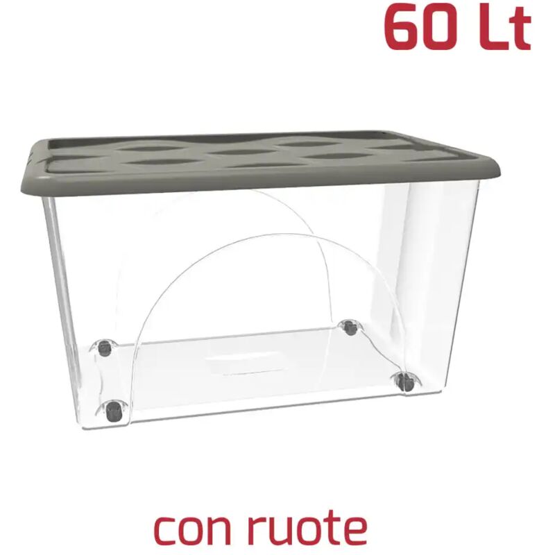 risparmia lo spazio siccome potete riporlo sullo scaffale porta oggetti La scatola di facile identificazione del contenuto- grazie al fatto che è trasparente potete sempre identificare cosa c'è in essa Scatole vuote possono essere messe una dentro l'altra e risparmiare lo spazio Dimensioni: 40 x 60 x h33 cm Capacità: 60 litri 4 pratiche ruote Coperchio: Color Talpa Modello: Dune, in Polipropilene