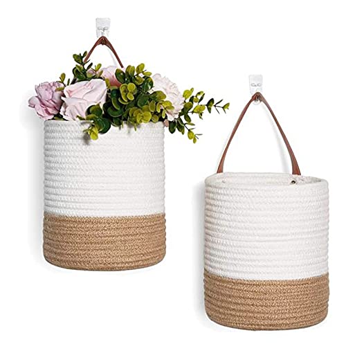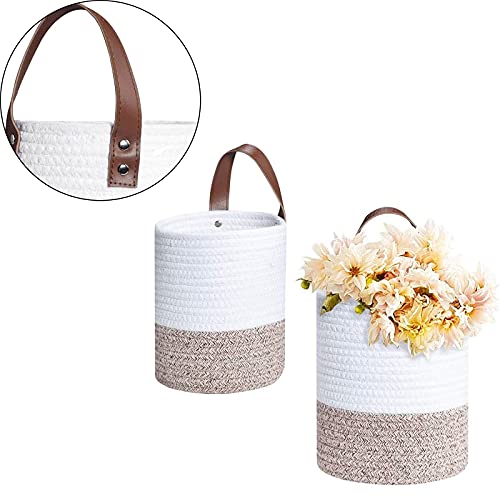 2 Cesti per Piante Intrecciati in Corda di Cotone, Cesto Portaoggetti, Set di cestini da Parete in Tessuto da Appendere con Manici in PU, per Riporre Piante Asciugamani Giocattoli Chiavi Portafogli