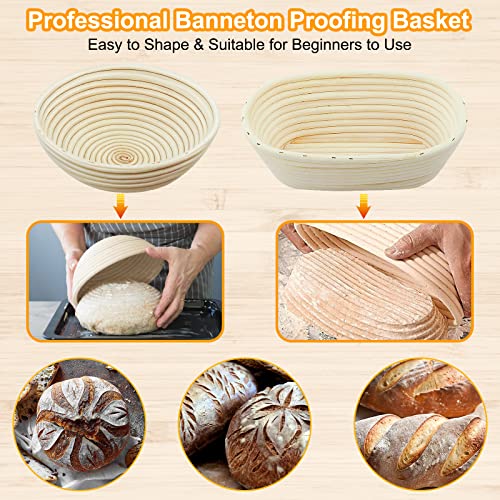 【RICEVERAI 2 STILI DI CESTINI PER IL PANE】 Cestini per il pane ovali da 10 pollici e cestini per il pane rotondi da 10 pollici, che contengono 2 libbre di pasta. Con 2 misure di biancheria lavabile, un raschietto per pasta in metallo perfetto per tagliare e trasferire la pasta del pane. L'incisione zoppa e 5 lame ti consente di creare motivi squisiti sulla superficie del pane.