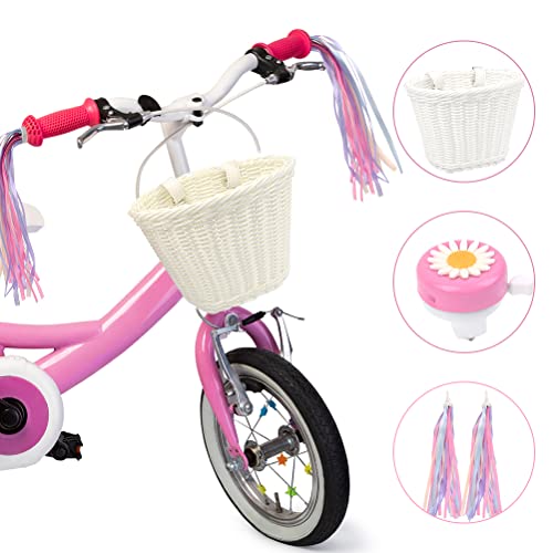 Set di 34 PCS Cestino Bici Bambino Tessuto a Mano Ragazze Cestino Bici Bambino con Cinghie di Cuoio Facile Installare Staccabile Campana Manubrio Filanti Streamers Accessori Decorazione di Bici