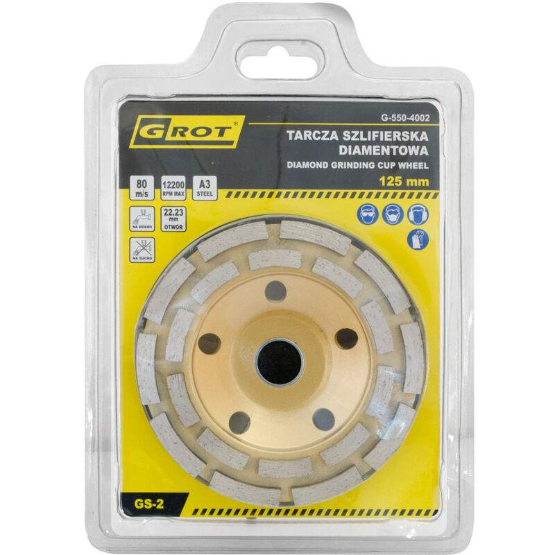 Dati tecnici: Parte principale del disco: acciaio A3. Velocità massima di rotazione: 80 m/s. Foro centrale: 22,23 mm. DISCO DIAMANTATO GS-2 125 mm: Disco diamantato destinato alla levigatura di superfici in cemento, pietra o altri materiali da costruzione. Adatto per lavorare su superfici asciutte o bagnate. L'uso del disco quando è bagnato ne prolungherà la durata.**Le foto mostrate sono solo a scopo illustrativo.