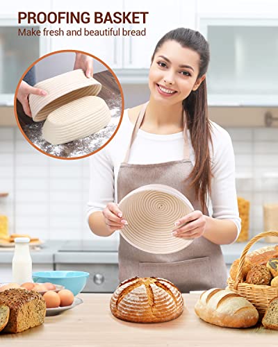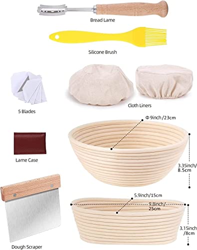 Cestino da Lievitazione per Pane, Ohuhu 2 Pezzi Cestino Lievitazione Pane, 23 cm Rotondo & 25 cm Ovale, con Lama per il Pane, 2 Fodere di Lino, Spatola per la Pasta, Pennello, 5 Lame