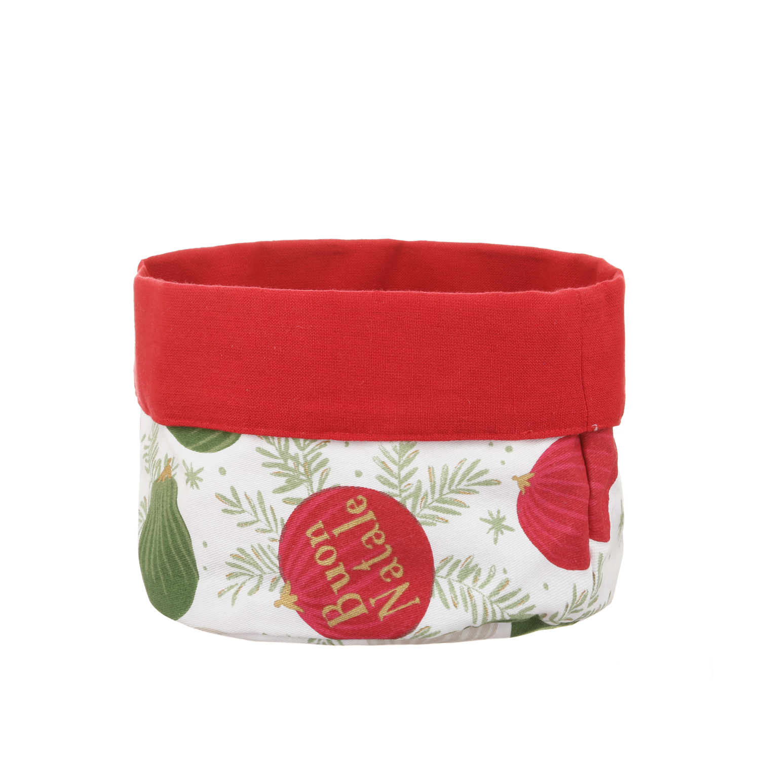 Aggiungi sulla tua tavola a tema natalizio questo grazioso dettaglio! Il cestino portapane ti permette di servire e offrire con eleganza il pane ai tuoi ospiti. Potrai inserire pane affettato, grissini, piccole pagnotte, focaccine, gallette e cracker in modo coreografico. Il decoro con palline color rosso e verde e scritta Buon Natale lo rende davvero delizioso e immancabile sulla tavola del pranzo o del cenone di Natale. Con un ciclo in lavatrice a 30° torna come nuovo e i colori non sbiadiscono. Misure: 20x20x15 cm.