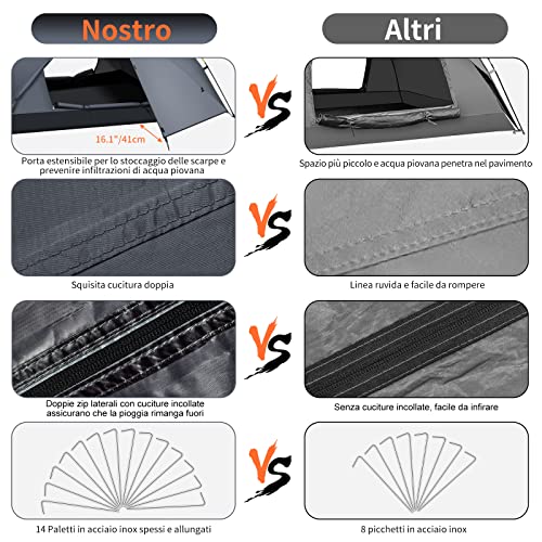 Unica Tenda Impermeabile a Tre Strati: 68D 210T poliuretano rivestito in poliestere PU 3000mm speciale materiale di rivestimento impermeabile, struttura a tre strati e squisito processo impermeabile e di incollaggio in ogni cucitura (cerniere, 4 angoli, ganci, fondo) assicurano che la nostra ultima tenda automatica possa resistere alle tempeste estive. (Vedere i risultati dei test nel video). L'esclusivo design della porta telescopica garantisce un perfetto isolamento dalla pioggia battente.