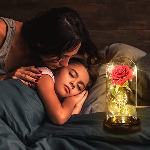 CGBOOM La Bella e La Bestia Rosa, Eterna Incantata Rosa in Cupola di Vetro con Luci a LED Fiori Artificiali con Base Legno Regalo per Festa della Mamma della Valentino Anniversario di Matrimonio