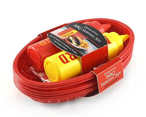 Il set include: 6 cestini rossi, 6 tovaglioli a scacchi rossi e bianchi, più un set di flaconi da spremere per ketchup e mostarda da 236.58 ml