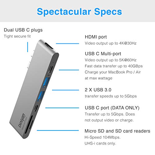 PORTI a BIZZEFFE: Una porta 4K@30Hz uscita video HDMI. Una porta USB-C THUNDERBOLT 3: 5K@60Hz video di uscita o ricaricare il Macbook Pro. UNA porta dati USB-C * * * solo per i dati solo * * * (nessun video in uscita, nessuna carica), due USB 3.0 (5Gbps), lettore di schede SD, Micro SD Card Reader