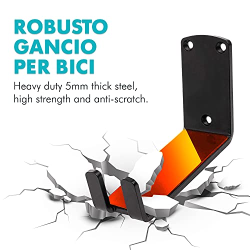 ✅ GANCI MURO RESISTENTI: I nostri ganci per biciclette a parete in ferro rivestito possono sostenere fino a 30 kg e sono quindi perfetti per tutti i più comuni tipi di biciclette. Puoi stare sicuro che reggeranno la tua bici senza alcun problema.
