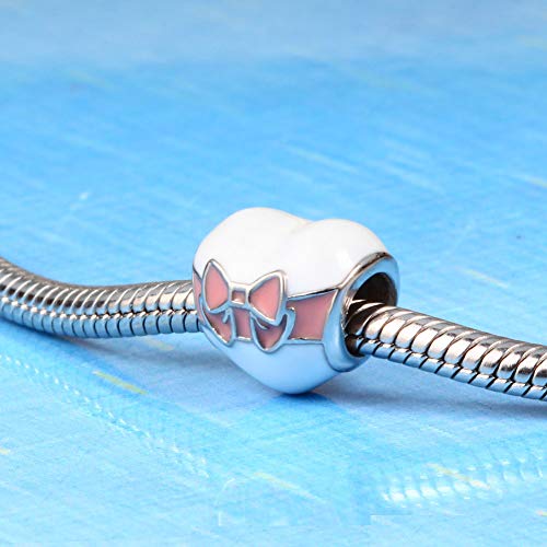 Charm in argento Sterling 925 con fiocco rosa a forma di cuore bianco smaltato, adatto per braccialetti in stile europeo
