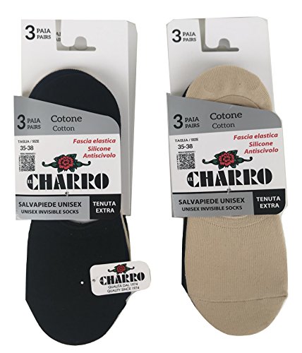 CHARRO. 6 paia calzini, calzini invisibili salvapiede con silicone sul tallone,calzini fantasmini in cotone estivo elasticizzato,unisex vari assortimenti. (39-42, assortito(nero,blu,beige))