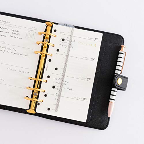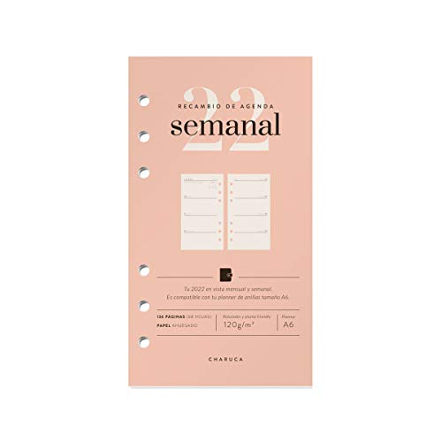 Agenda settimanale 2022. Contiene anche planner mensile. Questo ricambio è compatibile con il tuo diario ad anelli formato A6. Prodotto in Spagna, con amore e senza prismi.