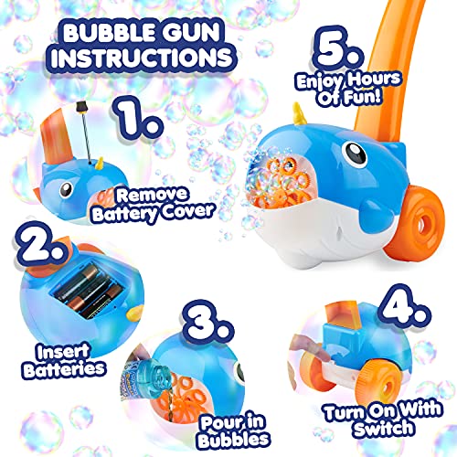 VELOCE E FACILE DA ASSEMBLARE -- i nostri giochi da giardino per bambini sono facili da montare e utilizzare. Attacca i manici alla macchina sparabolle, versa il liquido bolle sapone nel serbatoio, premi il pulsante di avvio e (sul retro della macchina bolle sapone) ed il divertimento avrà inizio.
