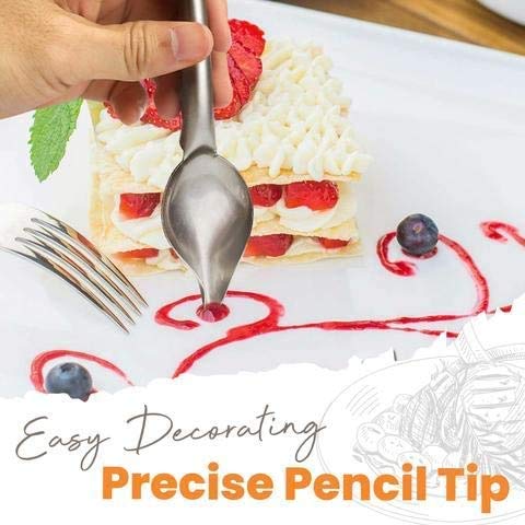 【Easy Precise Culinary Decorating】 It is designed with a narrow pencil-shaped tip to create smooth, precise lines and patterns easily! The wide spoon at the back holds your sauce steadily for an even and smooth dispensing!