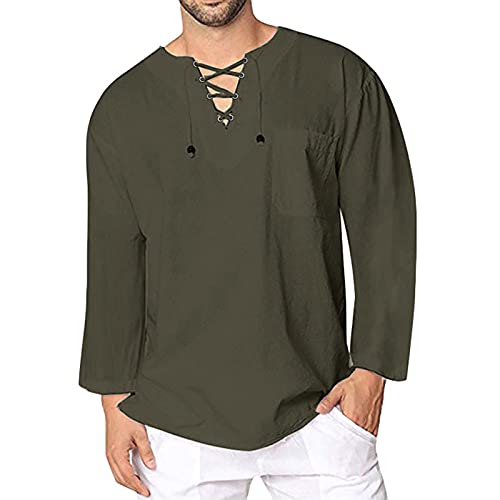 Chejarity Camicia da uomo in lino, a maniche lunghe, larghe, con coulisse, estiva, casual, vestibilità normale, in cotone, tinta unita, leggera, verde militare, L