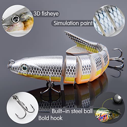 【Esca ealistica】 Le esche artificiali a più sezioni hanno i colori luminosi, stampe della pelle realistiche e occhi simulati in 3D, che riproducono brillantemente i colori e le fantasie dei pesci reali. Possono attirare efficacemente i pesci affamati e li innescano per attaccare.