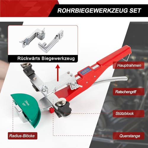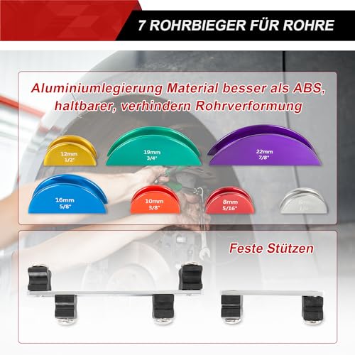 Set di strumenti: 1 utensile per curvare tubi, 2 supporti fissi, 7 teste di curvatura per tubi, 1 tagliatubi, 1 alesatore interno esterno, 1 tubo sbavatore, 1 valigetta in plastica ABS