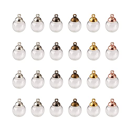 Emballage inclus: 60 pendentifs en verre globe de 14 mm. 6 capuchons de couleurs : bronze antique, bronze à canon, doré, platine, or rose, argent ;