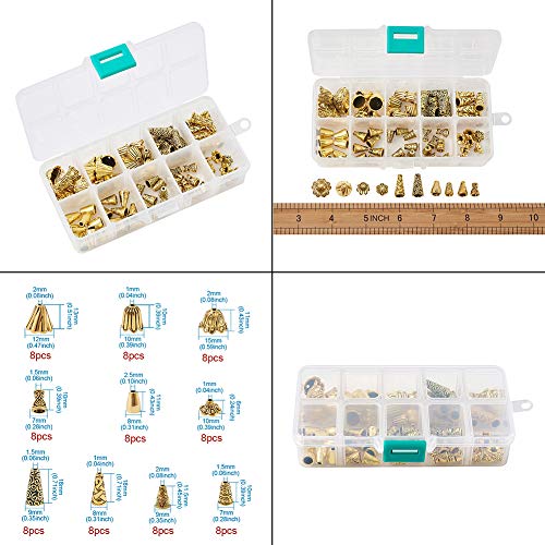 Dimensioni: circa 10-18mm di lunghezza, 7-12mm di larghezza, foro: 1-2mm. Si prega di leggere l'immagine 4 per ulteriori dettagli sulle dimensioni. La confezione include 10 diversi tappi per perline, 8 pezzi per stile, totalmente 80 tappi in metallo vintage per soddisfare i tuoi lavori artigianali assortiti.