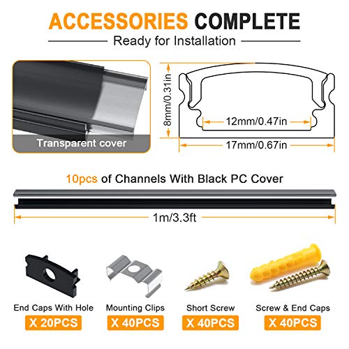Kit di installazione completo: dotato di accessori sufficienti, tra cui canale in alluminio da 1 m e paralume in PC (10 pezzi), 20 tappi terminali, 20 clip di montaggio, 40 viti (lunghe), 40 viti (corte) e 40 tappi terminali gialli per il montaggio completo del profilo in alluminio.
