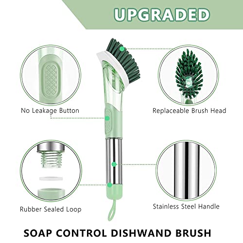 CHEVVY Spazzola Piatti con Dosatore Detersivo Spazzola Pulizia con 3 Diverse Testine sostituibili Spazzola da Cucina per Lavandino Pentola Padella (Verde)