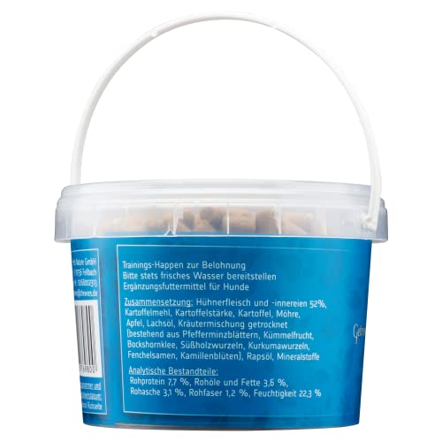 Contenuto della confezione: ci si aspetta 300 g di snack per cani in un secchio richiudibile. In caso di necessità forniamo regolarmente snack per cani nell'abbonamento risparmio
