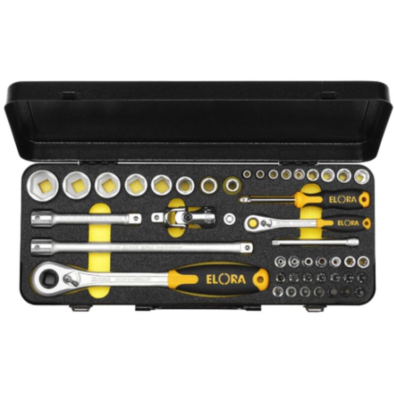 46-partite In una scatola di metallo nero con inserto in schiuma OMS Drive quadrate secondo Din 3120, ISO 1174 Strumenti di attuazione secondo Din 3122, ISO 3315