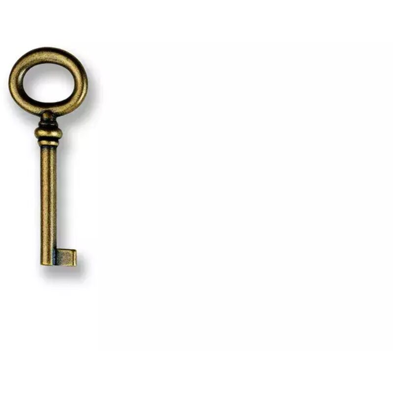 Chiave per mobile in ottone gambo mm.42, imgombro mm.29X77. Foro gambo mm.3.5. Finitura ottone antico.