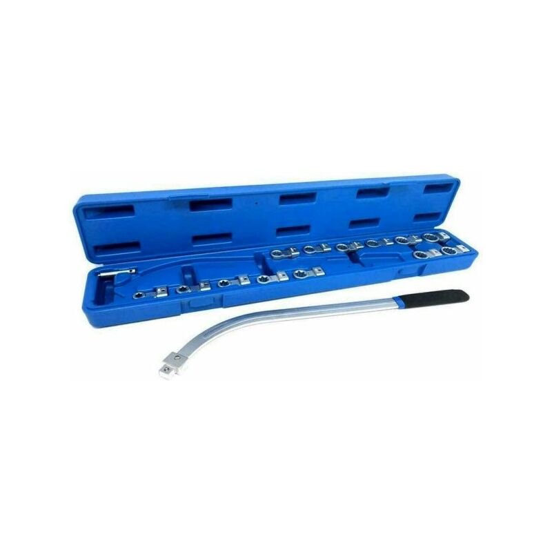 Descrizione prodotto CHIAVE CHIAVI TENDI CINGHIA METRICA E TORX TENSIONE INTERCAMBIABILE 14 PZ Chiavi per dadi tendicinghia, pulegge ausiliari e pulegge distribuzione 5 teste TORX: E10, E12, E14, E16, E18 8 Teste poligonali: 12-13-14-15-16-17-18-19 mm