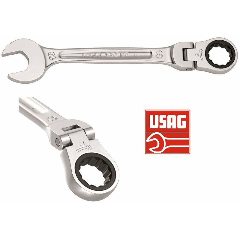 USAG 285 KF CHIAVE COMBINATA A CRICCHETTO SNODATA FISSA E STELLA SNODO COMBINATE CARATTERISTICHE Forchetta con sistema antislittamento dell'esagono durante la manovra - Angolo di lavoro del cricchetto regolabile a 180° - Forchetta inclinata di 15° - Angolo di ripresa di 5° Codice Bocca esagonale mm L mm U02856108 8 127,5 U02856109 9 132 U02856110 10 136,5 U02856111 11 141,5 U02856112 12 148 U02856113 13 155 U02856114 14 161 U02856115 15 170 U02856116 16 180 U02856117 17 191 U02856118 18 204 U02856119 19 216