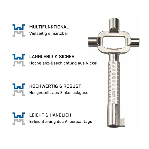 W+M, chiave da costruzione, chiave da architetto, chiave multifunzione nichelata, chiave universale con scala di misurazione per cilindri