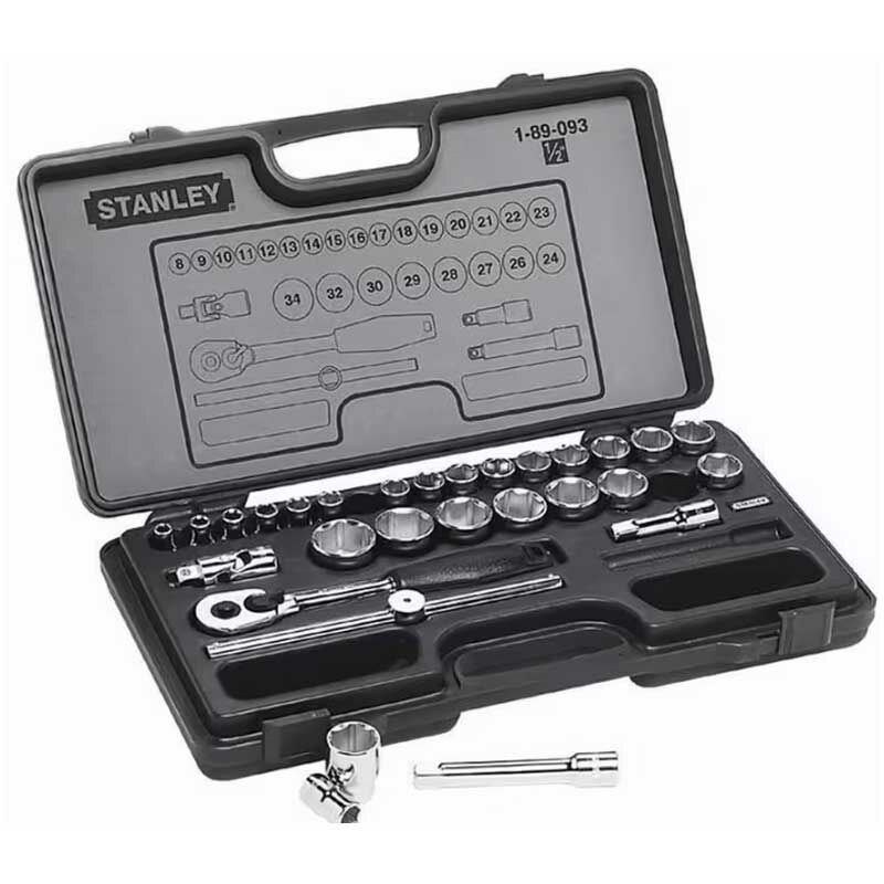 Chiave A Cricchetto Con Bussole Assortite Stanley 189093 è uno strumento completo progettato per una vasta gamma di applicazioni di serraggio e svitaggio. Con bussole assortite da 8 a 34 mm, cricchetto resistente, prolunghe, snodo e quadro maschio con spina scorrevole, questo set offre versatilità e affidabilità per affrontare diverse esigenze di lavoro. La costruzione robusta e la varietà di accessori inclusi rendono questo set un compagno ideale per professionisti e hobbisti. La valigetta contiene: Bussole 1/2 da (mm): 8-9-10-11-12-13-14-15-16-17-18-19-20-21-23-24-26-27-28-29-30-32-34 Cricchetto Prolunga da 75 mm Prolunga da 125 mm Snodo Quadro maschio con spina scorrevole