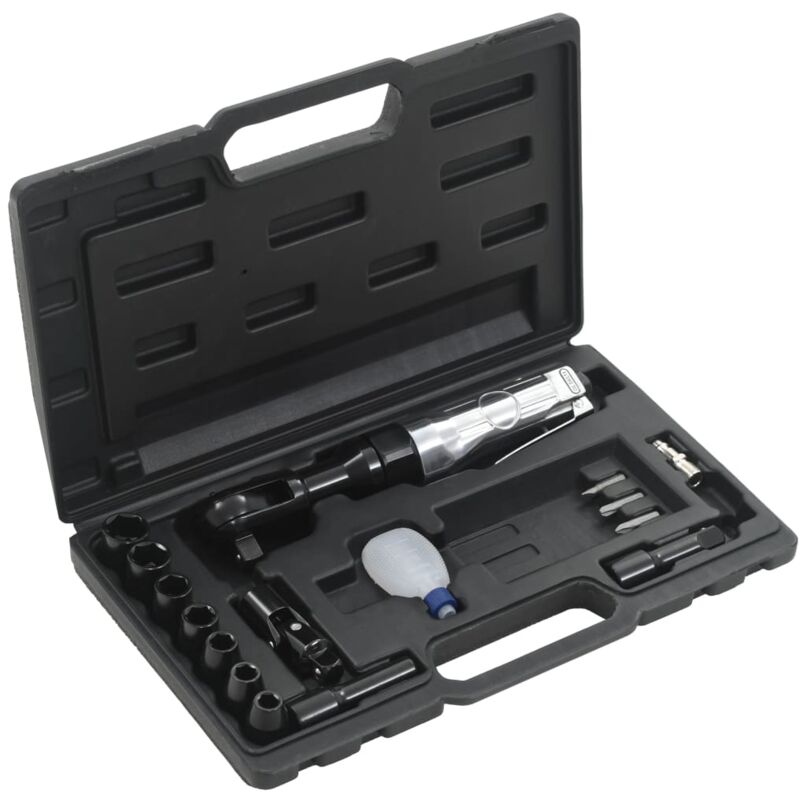 Questo set contiene 1 chiave a cricchetto pneumatica, 7 bussole di diverse dimensioni, 1 barra di prolunga, 1 nipplo, 1 giunto cardanico, 1 contenitore per olio, 1 supporto per punte e 3 punte. Questo set di strumenti è indispensabile per garage e officine. La chiave a cricchetto è dotata di uno sfiato anteriore per l'aria e la sua rotazione può essere regolata (in senso orario o antiorario) con un interruttore collocato sulla testa del cricchetto. Tutte le componenti vengono consegnate in una pratica custodia stampata tramite soffiaggio. Materiale: Alluminio e plastica Dimensioni della custodia: 35 x 21 cm (L x L) Lunghezza della chiave a cricchetto: 27 cm Dimensione della testa: 1/2 Velocità senza carico: 150 giri/min Torsione massima: 61 Nm Consumo d'aria: 5 CFM Pressione massima di lavoro: 6,3 bar Interruttore avanti/indietro Scarico dell'aria anteriore La consegna include: 1 Chiave a cricchetto pneumatico 7 Bussole (9 mm, 10 mm, 11 mm, 13 mm, 14 mm, 17 mm e 19 mm) 1 Barra di