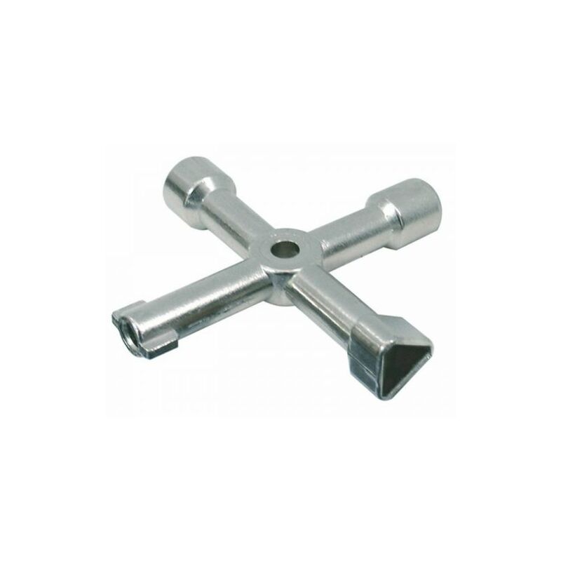 CHIAVE MULTIUSO QUADRI GAS ACQUA ELETTRICITA In zama nichelata. Utile anche per lo sblocco di cancelli in caso di assenza di energia elettrica. Impronte: quadro 7x12, triangolo piccolo 7x13, triangolo grande 10x13 e tondo alettato 5x9x14.
