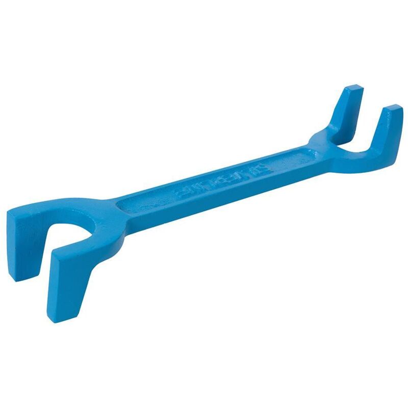 250 mm Double-ended cast iron wrench for 27mm and 32mm WC and basin nuts. For use with 15mm and 22mm copper tube fittings. Use in horizontally/vertically confined areas. Grips on smooth/oily surfaces.