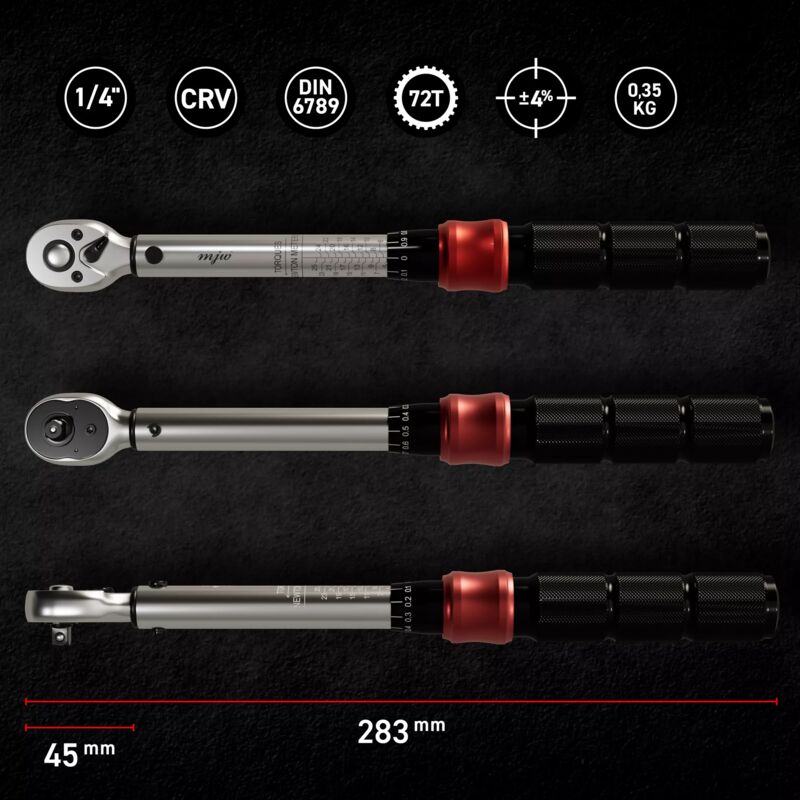 Chiave dinamometrica 1/4" 72T 5 25 Nm Chiave dinamometrica marca MJW in acciaio legato al cromo-vanadio per il serraggio di viti con la coppia adeguata. Scegliendo il nostro prodotto riceverete: certificato di taratura della chiave dinamometrica un manuale d'uso toro;
