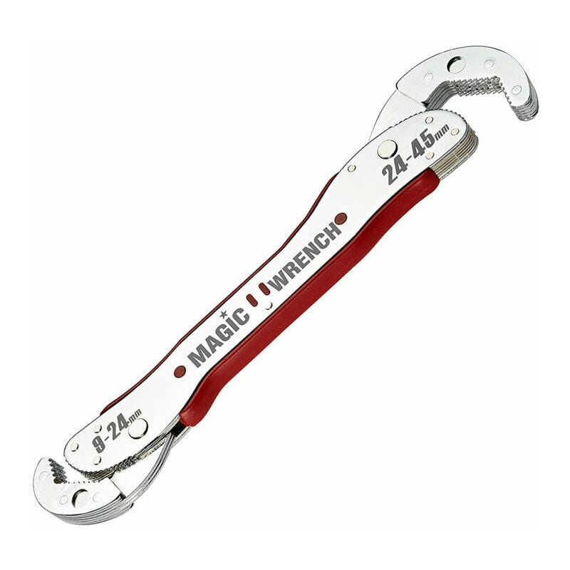 Il design a doppia testa di questa chiave magica offre più comodità a tutti. 2 diverse specifiche: 9~24mm e 24~45mm per soddisfare le esigenze di un uso più ampio. Può applicare la massima forza e coppia proteggendo allo stesso tempo la superficie dei dadi nelle situazioni di allentamento o fissaggio. Rispetto alla normale chiave inglese, l'apertura crescente di questa chiave magica può funzionare in spazi ristretti anche a 30 gradi. La chiave multifunzione Super Magic è adatta per serrare e allentare tutte le forme di tubi e dispositivi di fissaggio come: esagono, quadrato, triangolo, dado circolare, bulloni, tubi in acciaio, tubi in plastica, rubinetto dell'acqua. La chiave magica è un must per ogni strumento del kit idrico, non dovrai più cercare lo strumento giusto, no più tempo perso. Con lo strumento sbagliato, puoi facilmente danneggiare il dado o avvitare i denti della chiave magica. Sono progettati per dargli una forma da pitbull e non lasciarlo andare - La chiave magica