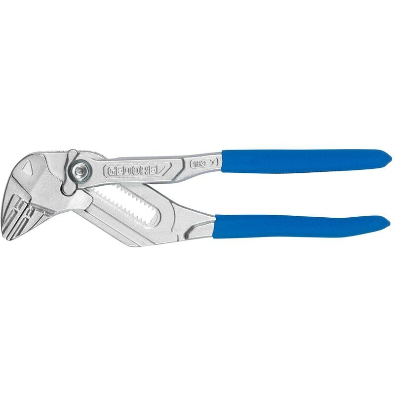 Funzione di giravite e pinza in un unico utensile, DIN ISO 5743, Può sostituire 2 set completi di chiavi di manovra, metriche e in pollici (0-42 mm e 0 - 1.5/8), Montaggio delicata di raccordi a vite dalla superficie sensibile (ad esempio raccordi idraulici cromati), Utensile universale regolabile per avvitare, Ideale per piegatura, supporto, pressione e presa di diversi pezzi, Installazione senza gioco e senza rischio di danni ai bordi, Regolazione praticamente continua dell'apertura mediante meccanismo di scorrimento e ganasce parallele, Tenuta sicura dell'apertura della chiave selezionata, Attivazione del meccanismo di scorrimento praticamente da qualsiasi posizione di regolazione, Utilizzabile come chiave a cricchetto - rapido e comodo serraggio e allentamento di viti e dadi esagonali, L'alto rapporto di trasmissione (>1:10) consente un'elevata forza di spinta e serraggio delle ganasce, In acciaio da bonifica speciale GEDORE per il massimo carico, Utilizzabile come potente morsa