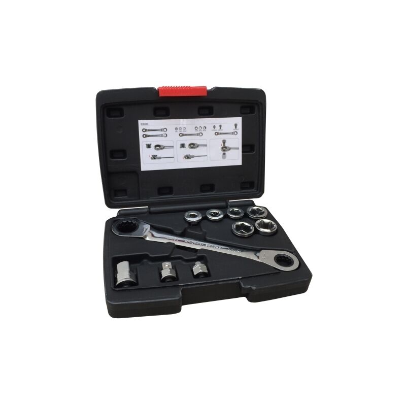 Chiave a cricchetto in cromo vanadio con attacco poligonale. Fornita di 7 bussole esagonali e di adattatori da 1/2 3/8 1/4. Le bussole hanno due misure e possono essere inserite in entrambi i versi per utilizzare la rotazione dx e sx.