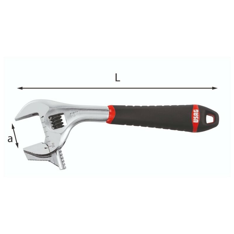 Chiave a rullino Nella posizione standard può manovrare un profilo esagonale Possibilità di manovrare un profilo tondo invertendo il dente mobile Grande capacità: apertura +20% rispetto allo standard Dotato di scala in millimetri e pollici Dotato di impugnatura ergonomica Testa inclinata di 22° Dotata di rullino in acciaio Possibilità di fissaggio tramite asola Finitura cromata Lunghezza: 240mm