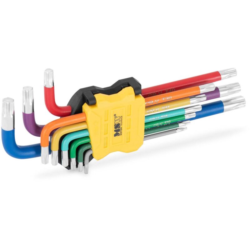 Chiave torx MSW Con il set di chiavi angolari ACC-LKT1 di MSW hai una presa salda su ogni vite esagonale Torx. La selezione di chiavi diverse offre la soluzione perfetta per le viti più comuni. Questo pratico set di chiavi angolari include ben nove chiavi esagonali, per permetterti di avere sempre la grandezza giusta a portata di mano e poter quindi applicare la coppia di serraggio ottimale alla vite utilizzata. Nei lavori più duri, il set in acciaio legato e temperato convince con la sua elevata stabilità. In questo modo avrai sempre lo strumento giusto per stringere o allentare la maggior parte delle viti Torx. Le chiavi angolari Torx nelle dimensioni da T10 a T50 convincono con una trasmissione ottimale della forza e con una coppia di serraggio elevata. Lavorare sarà una passeggiata, grazie all'ordinato supporto in plastica dotato di indicazioni di grandezza e marcature colorate. Dettagli tecnici Materiale Acciaio inox Quantità 9 pezzi Contenuto della spedizione Chiave torx