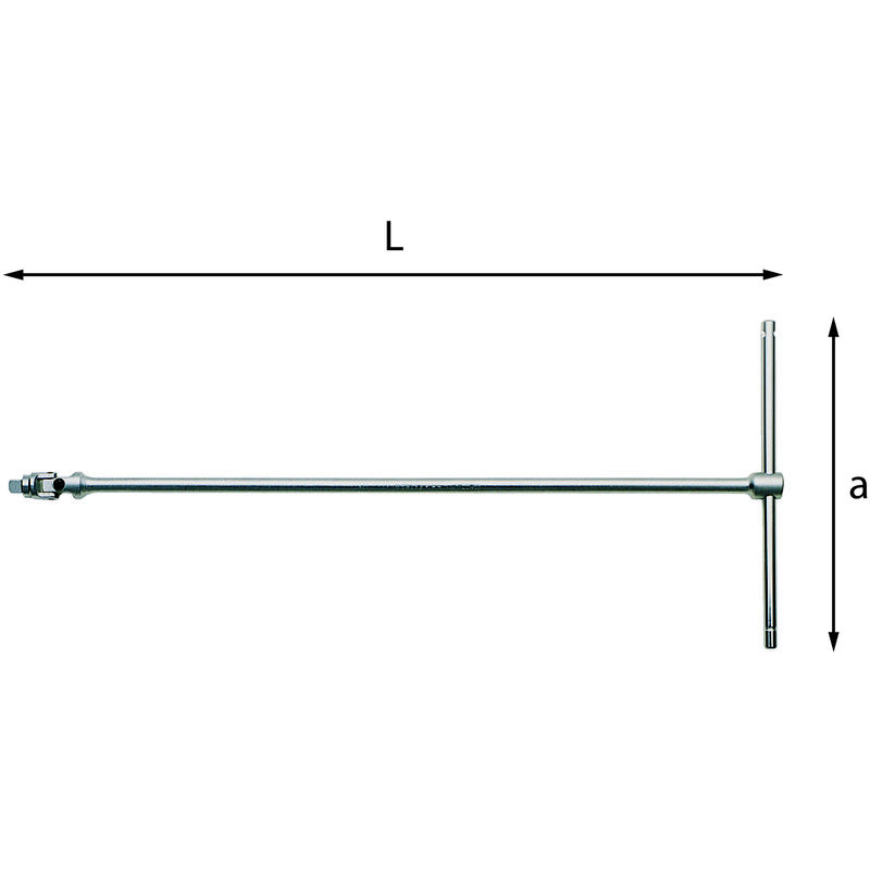 CHIAVE A T CON ATTACCO QUADRO SNODATO Modello a snodo cardanico con molla di frizione per consentire il preposizionamento della bussola con l'inclinazione desiderata Asta di manovra scorrevole ed estraibile Acciaio speciale altamente legato al Cromo Vanadio Esecuzione cromata Codice L mm a mm U02730202 460 175