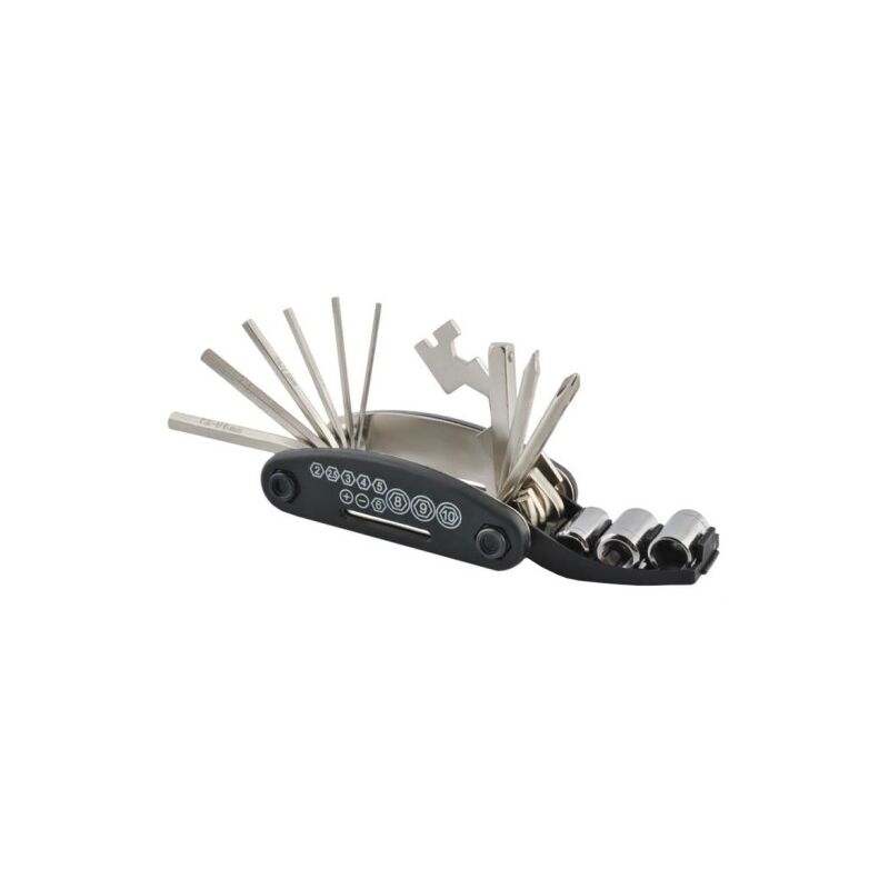 Set di chiavi per bicicletta 16 in 1 Il set compatto di chiavi per bicicletta 16 in 1 è un ottimo strumento per ogni ciclista. Il tutto era chiuso a forma di temperino. Le sue dimensioni ridotte ti permettono di portarlo sempre con te nella borsa della bicicletta, nello zaino o in tasca. Il set contiene gli strumenti più necessari per riparazioni rapide e indipendenti della bicicletta. Con questo set puoi affrontare lunghi viaggi in sicurezza. Il set comprende i seguenti strumenti: bussole esagonali: 2, 2,5, 3, 4, 5,6, adattatore per presa, bussole: 8 mm, 9 mm, 10 mm, chiave piatta: 8 mm. 10 mm, 15 mm, chiave per raggi 14GE, cacciavite piatto, cacciavite Phillips