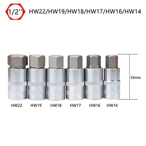 Contiene: 12 inserti esagonali da 1/2": 5 mm, 6 mm, 7 mm, 8 mm, 10 mm, 12 mm, 14 mm, 16 mm, 17 mm, 18 mm, 19 mm, 22 mm