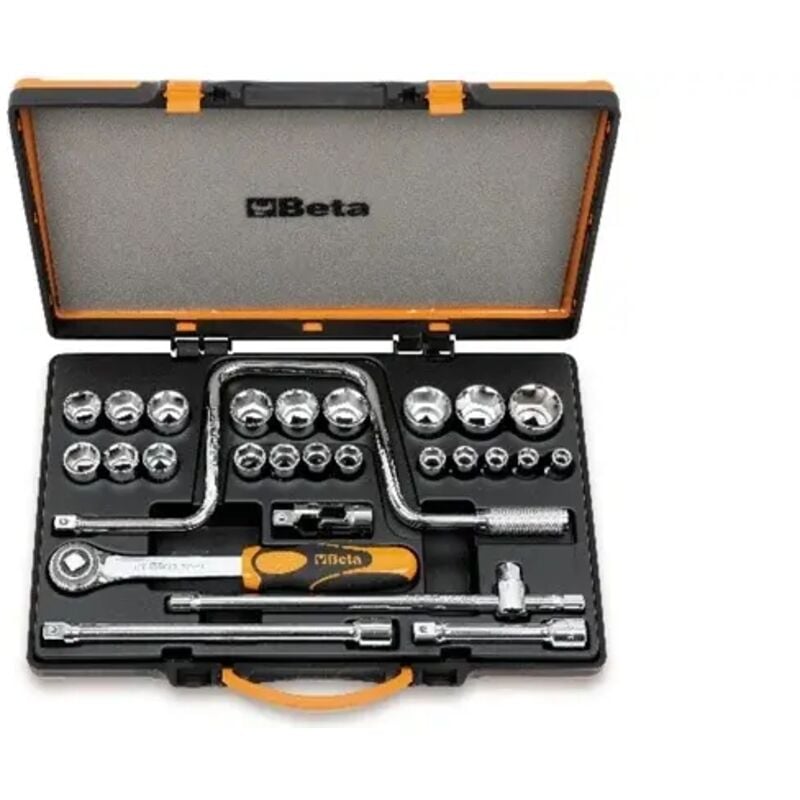 21 chiavi a bussola esagonali e 6 accessori in cassetta di lamiera. Attacco: 1/2 Pezzi per confezione: 27 Profilo bussole: Poligonale Unità di misura bussole: Millimetri Bussole fornite: Beta 920b 10-11-12-13-14-15-16-17-18-19-20-21-22-23-24-25-26-27-28-30-32 Cricchetto: Beta 920/55 Prolunga: Beta 920/21 - 920/22 Snodo: Beta 920/25 Quadro maschio: Beta 920/46 Quadro scorrevole: Beta 920/42 Valigetta: 420x280x60 mm Peso: 7118 g