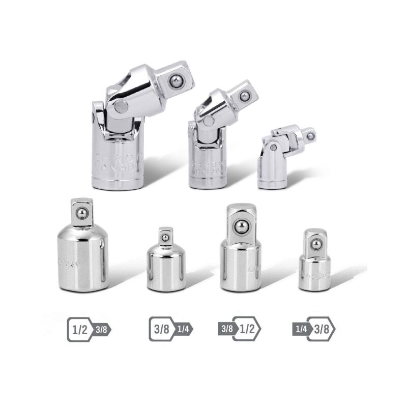 Set di 7 adattatori che vi permetteranno di utilizzare la vostra chiave a bussola, il vostro avvitatore con un'ampia gamma di inserti. L'offerta comprende 3 adattatori con snodo e 4 adattatori fissi. Interamente costruiti in cromo vanadio.